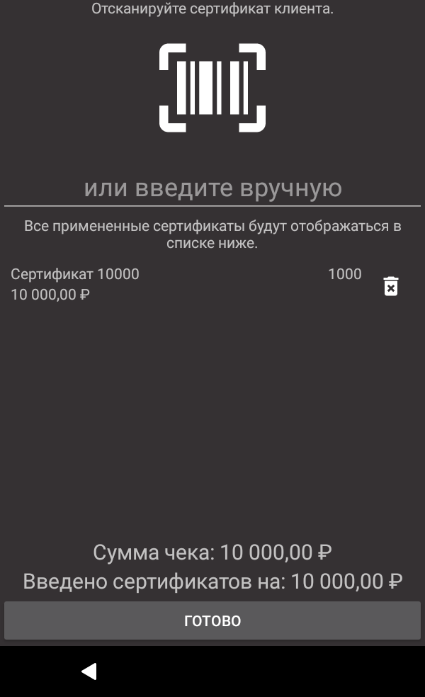 Примечание: например, планируется работа с сертификатами на 1000, на 5000 и на 10000 рублей, то в данном случае необходимо завести только три карточки товара на терминале с ценой 1000, 5000 и 10000 рублей.