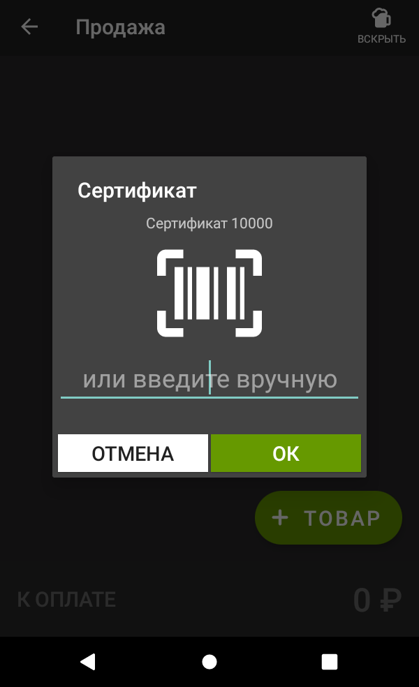 2. В открывшемся окне укажите номер сертификата или считайте штрихкод. Нажмите "ОК".