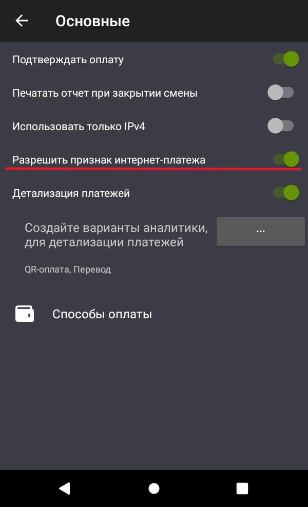Далее в Настройках активируйте опцию "Разрешить признак интернет платежа".