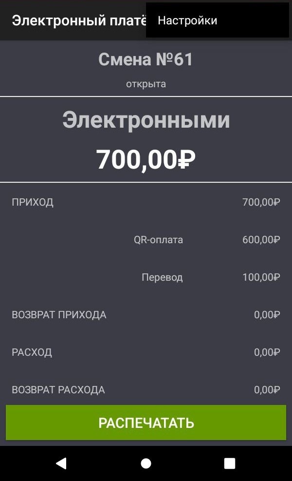 Для начала необходимо активировать соответствующую опцию в настройках приложения. Для этого на кассе зайдите под администратором, найдите приложение "Электронный платёж" на рабочем столе кассового аппарата и откройте его. Справа сверху нажмите три точки - Настройки.