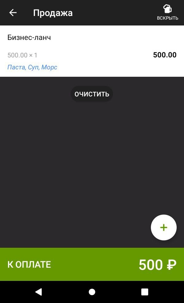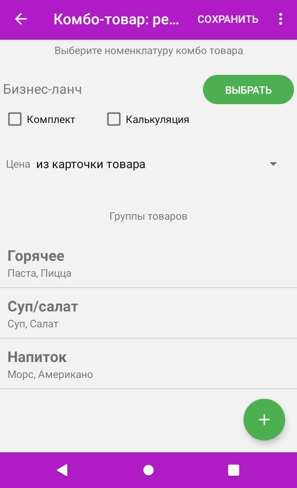 Создать комбо-товар, который можно использовать как Бизнес-ланч. Чтобы при добавлении комбо-товара в чек появлялся список выбора позиций для каждой категории и при оплате в чеке были указаны выбранные блюда как подпозиции.