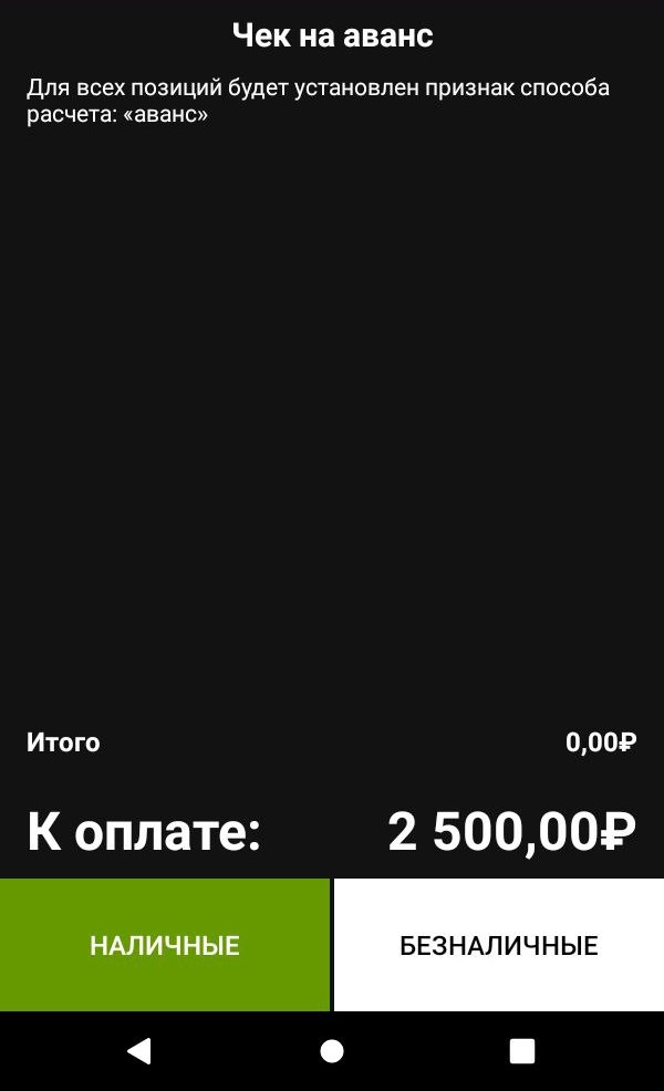 Для всех позиций будет установлен признак способа расчёта: "полный расчёт". - Чек на аванс.