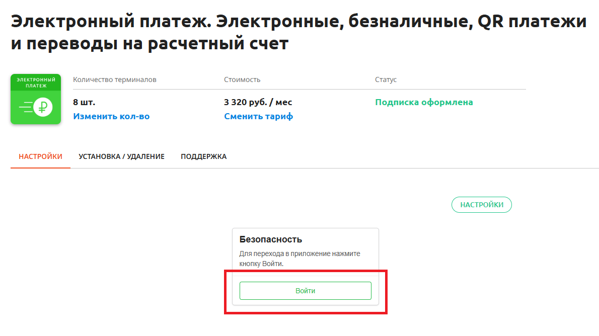 1. В личном кабинете Эвотор потребуется открыть раздел Мои приложения - Электронный платёж - Войти или На весь экран.